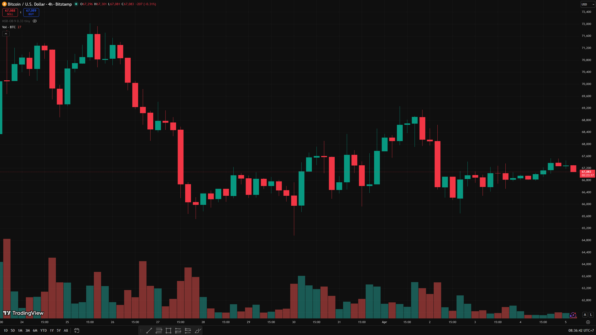 Tính đến sáng 5.4, Bitcoin được giao dịch quanh 67.096 USD, tăng 0,37% trong 24 giờ qua - Ảnh: Binance