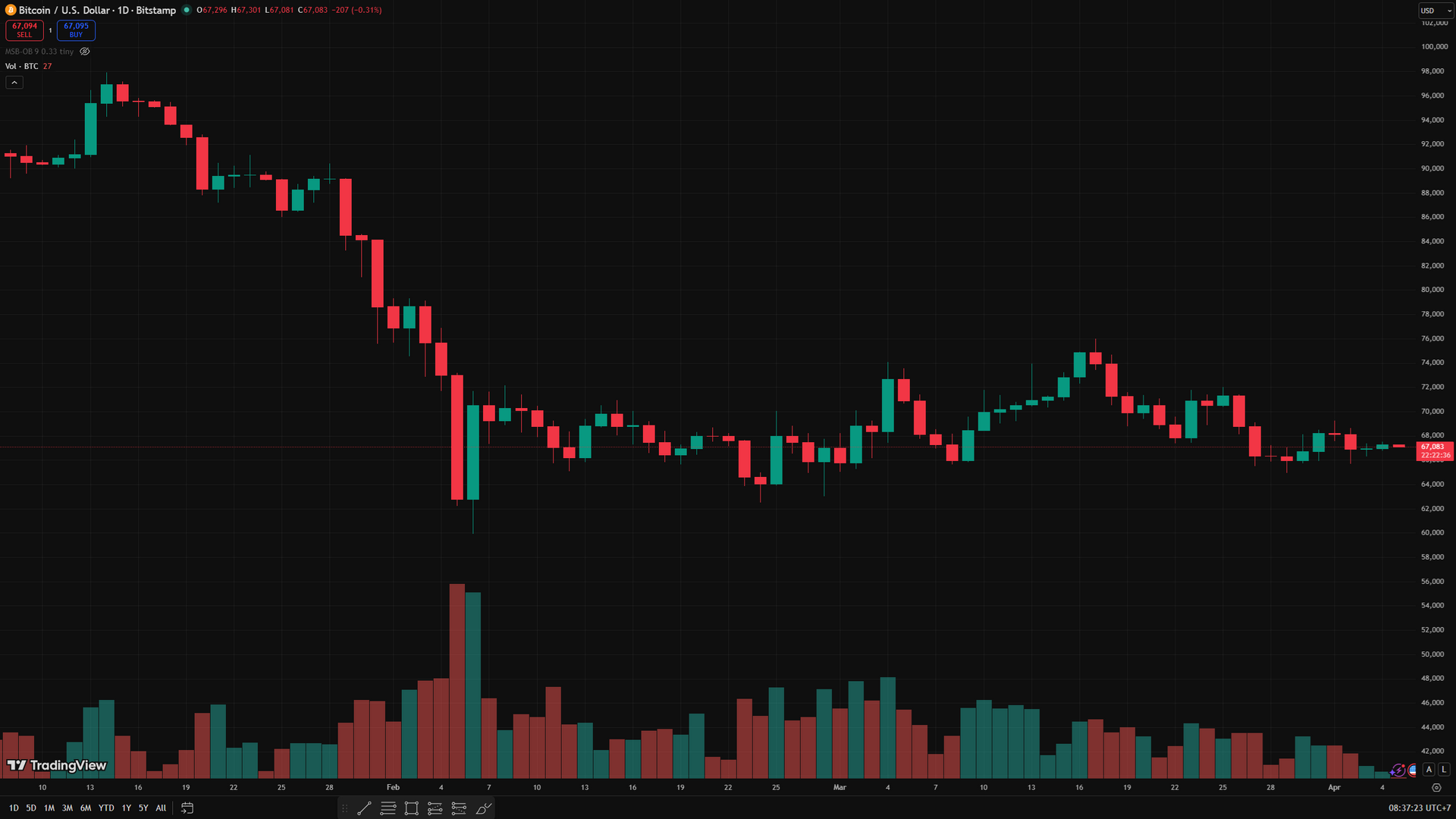 Trên khung thời gian ngày (D1), Bitcoin tiếp tục duy trì cấu trúc giảm trung hạn sau nhịp điều chỉnh mạnh từ vùng 98.000 USD. Chuỗi nến giảm kéo dài trước đó đã phá vỡ xu hướng tăng, đưa giá về vùng tích lũy quanh 65.000 - 70.000 USD. Hiện tại, giá dao động quanh mốc 67.000 USD với biên độ hẹp, cho thấy thị trường đang bước vào trạng thái đi ngang sau khi giảm sâu. Khối lượng giao dịch có xu hướng suy yếu dần, phản ánh dòng tiền thận trọng và thiếu động lực bứt phá rõ ràng.