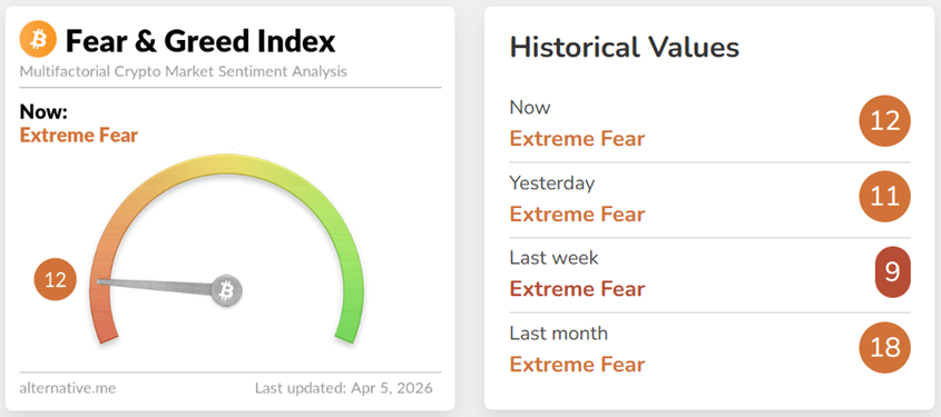 Chỉ số Sợ hãi & Tham lam (Crypto Fear & Greed Index) ngày 5.4 ghi nhận mức 12 điểm, tiếp tục nằm trong vùng “Extreme Fear” (sợ hãi tột độ). So với mức 11 điểm của ngày trước đó, chỉ số có sự cải thiện nhẹ, cho thấy tâm lý nhà đầu tư phần nào ổn định hơn. Tuy nhiên, mức tăng này chưa đủ để thay đổi trạng thái chung của thị trường, khi nỗi lo ngại vẫn chiếm ưu thế.