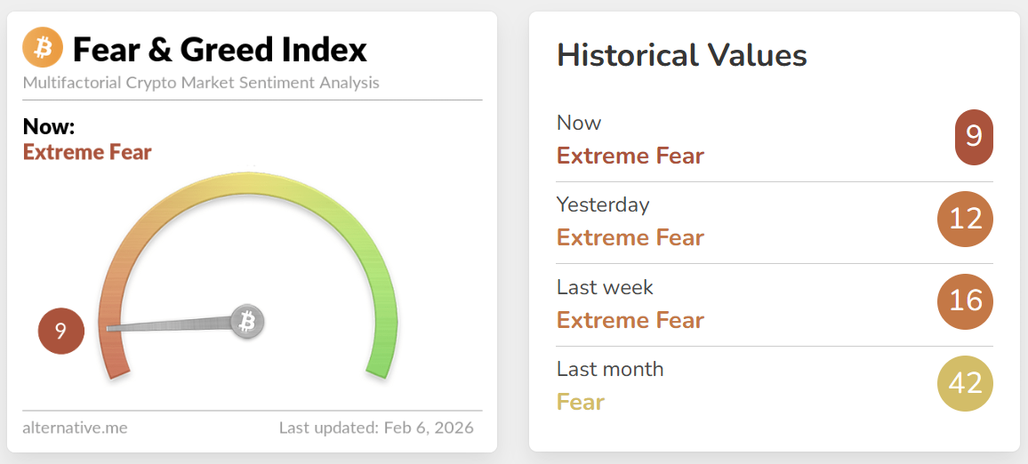 Chỉ số Sợ hãi & Tham lam (Fear & Greed Index) của thị trường tiền mã hóa ngày 6.2 giảm sâu xuống mức 9, tiếp tục nằm trong vùng “sợ hãi tột độ” (Extreme Fear), phản ánh tâm lý bi quan đang bao trùm thị trường. So với ngày hôm qua (12 điểm) và tuần trước (16 điểm), chỉ số này cho thấy mức độ hoảng loạn đang gia tăng nhanh chóng, chủ yếu xuất phát từ đà giảm mạnh và kéo dài của Bitcoin cũng như phần lớn altcoin.