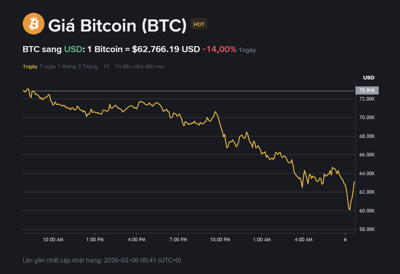 Tính đến sáng 6.2, Bitcoin được giao dịch quanh 62.766 USD, giảm 14% trong 24 giờ qua - Ảnh: Binance
