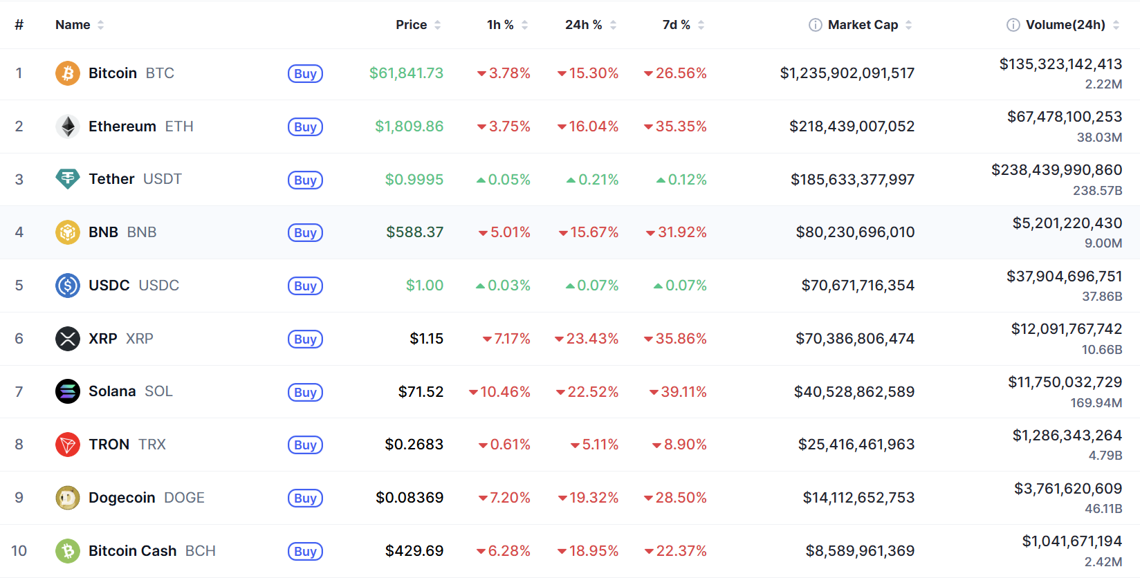 Biến động của Top 10 đồng coin lớn nhất thế giới