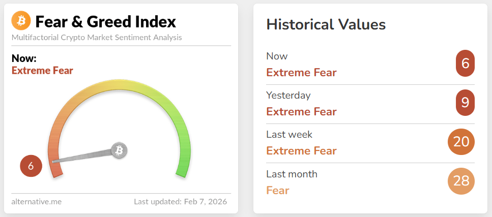 Chỉ số Sợ hãi & Tham lam (Fear & Greed Index) của thị trường tiền mã hóa ngày 7.2 ghi nhận ở mức 6 điểm, phản ánh trạng thái “sợ hãi tột độ” (Extreme Fear) đang chiếm ưu thế rõ rệt trong tâm lý nhà đầu tư. So với ngày hôm qua (9 điểm), mức giảm này cho thấy tâm lý bi quan tiếp tục gia tăng, bất chấp việc một số đồng tiền lớn ghi nhận nhịp hồi giá trong ngắn hạn.