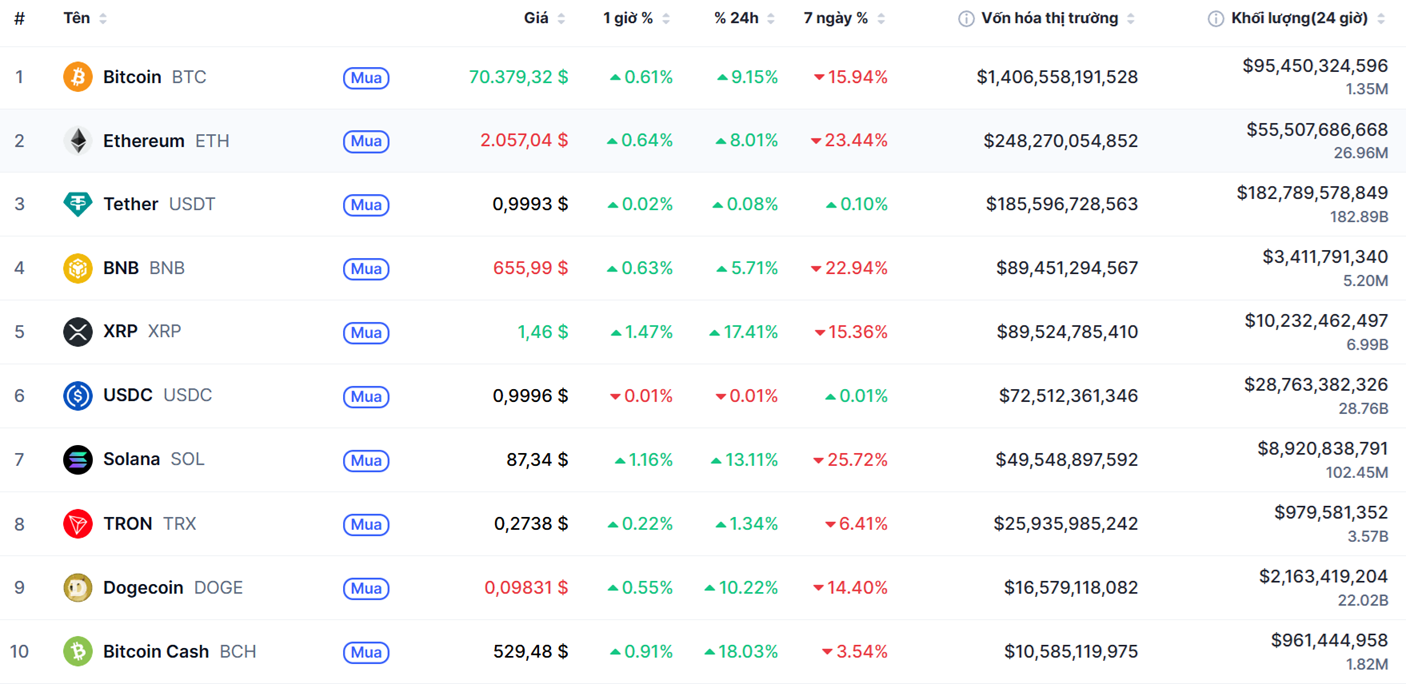 Giá Bitcoin hiện đang giao dịch quanh mức 70.433 USD, với vốn hóa thị trường vào khoảng 1.407 tỉ USD và khối lượng giao dịch trong 24 giờ đạt gần 100 tỉ USD.