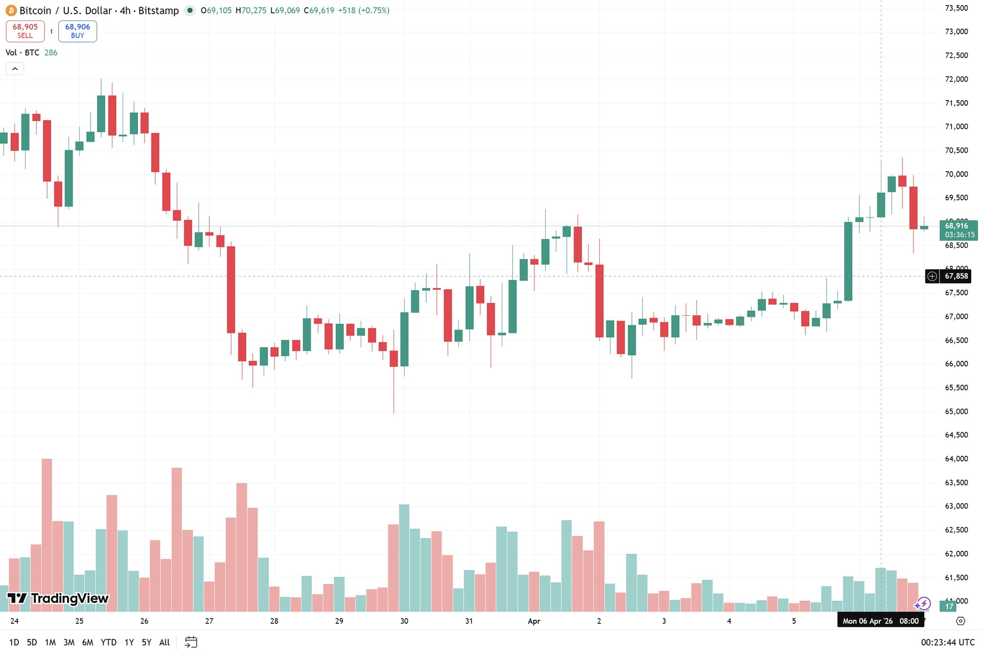 Biểu đồ BTC/USD theo khung 4 giờ tính đến 7.4 - Ảnh: TradingView/Bitstamp