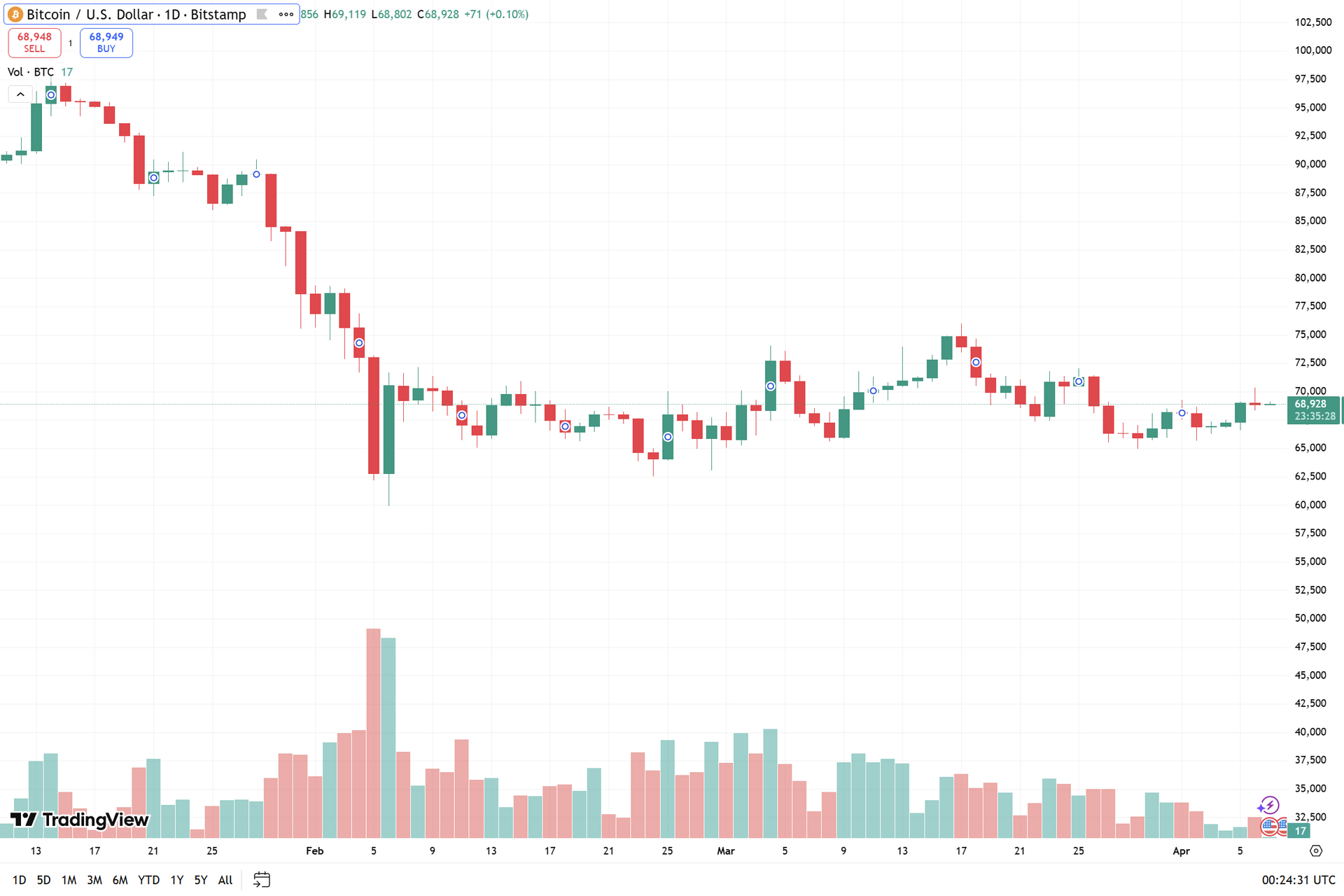 Biểu đồ giá theo ngày của BTC tính đến 7.4 - Ảnh: TradingView/Bitstamp
