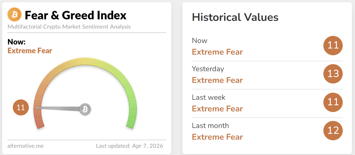 Chỉ số Sợ hãi & Tham lam (Crypto Fear & Greed Index) ngày 7.4 ghi nhận mức 11 điểm, tiếp tục duy trì trong vùng “Extreme Fear” (sợ hãi tột độ). So với mức 13 điểm của ngày trước đó, chỉ số đã giảm nhẹ, cho thấy tâm lý bi quan có xu hướng gia tăng trở lại sau một nhịp cải thiện ngắn hạn. Diễn biến này phản ánh sự thiếu ổn định trong niềm tin của nhà đầu tư, khi thị trường vẫn chưa hình thành xu hướng rõ ràng.
