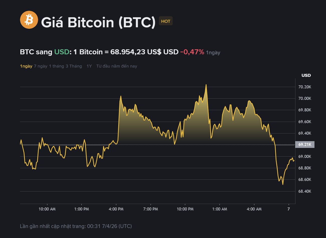 Tính đến sáng 7.4, Bitcoin được giao dịch quanh 68.954 USD, giảm 0,47% trong 24 giờ qua - Ảnh: Binance