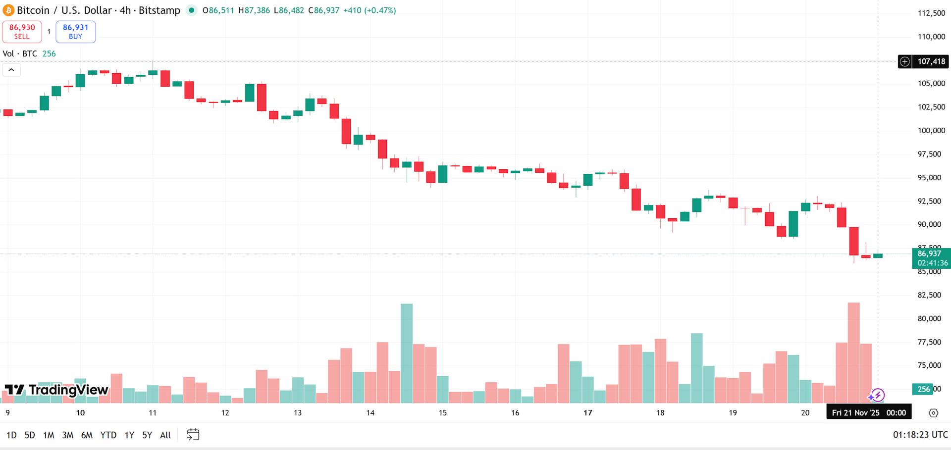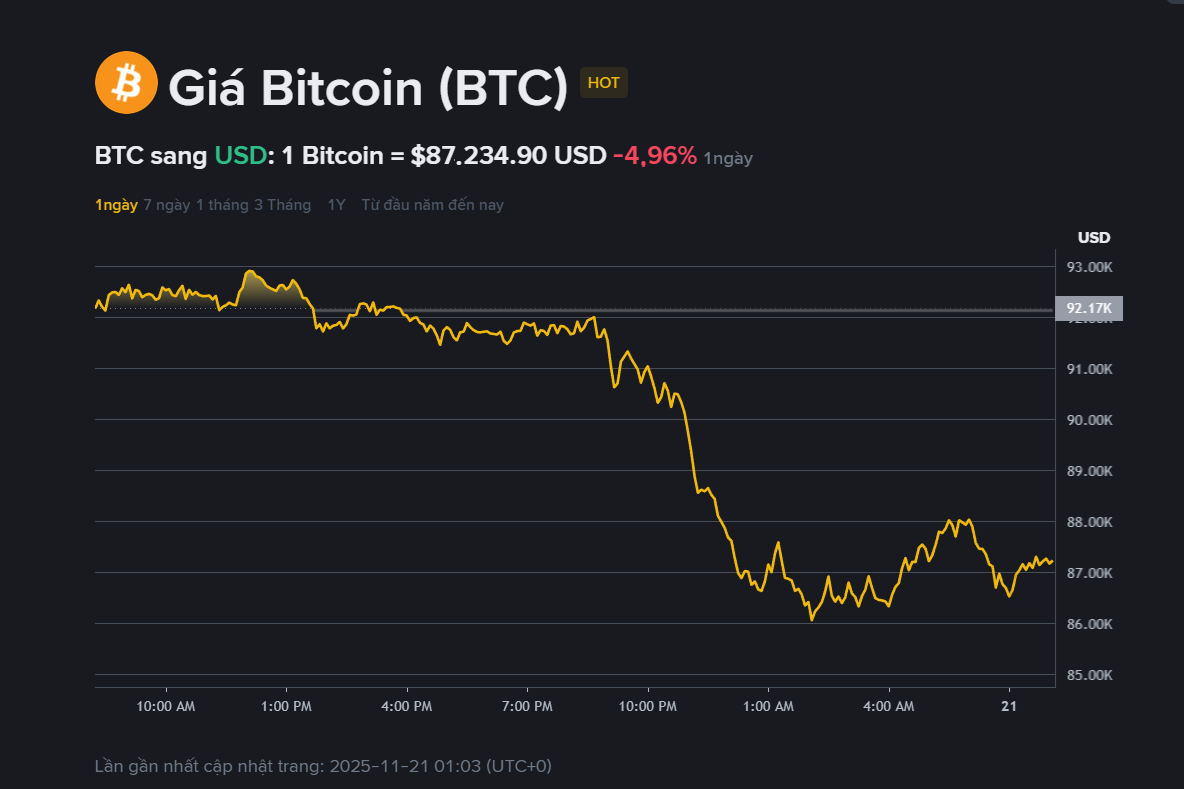 Tính đến sáng 21.11, Bitcoin được giao dịch quanh 87.200 USD, giảm gần 5% trong 24 giờ qua - Ảnh: Binance