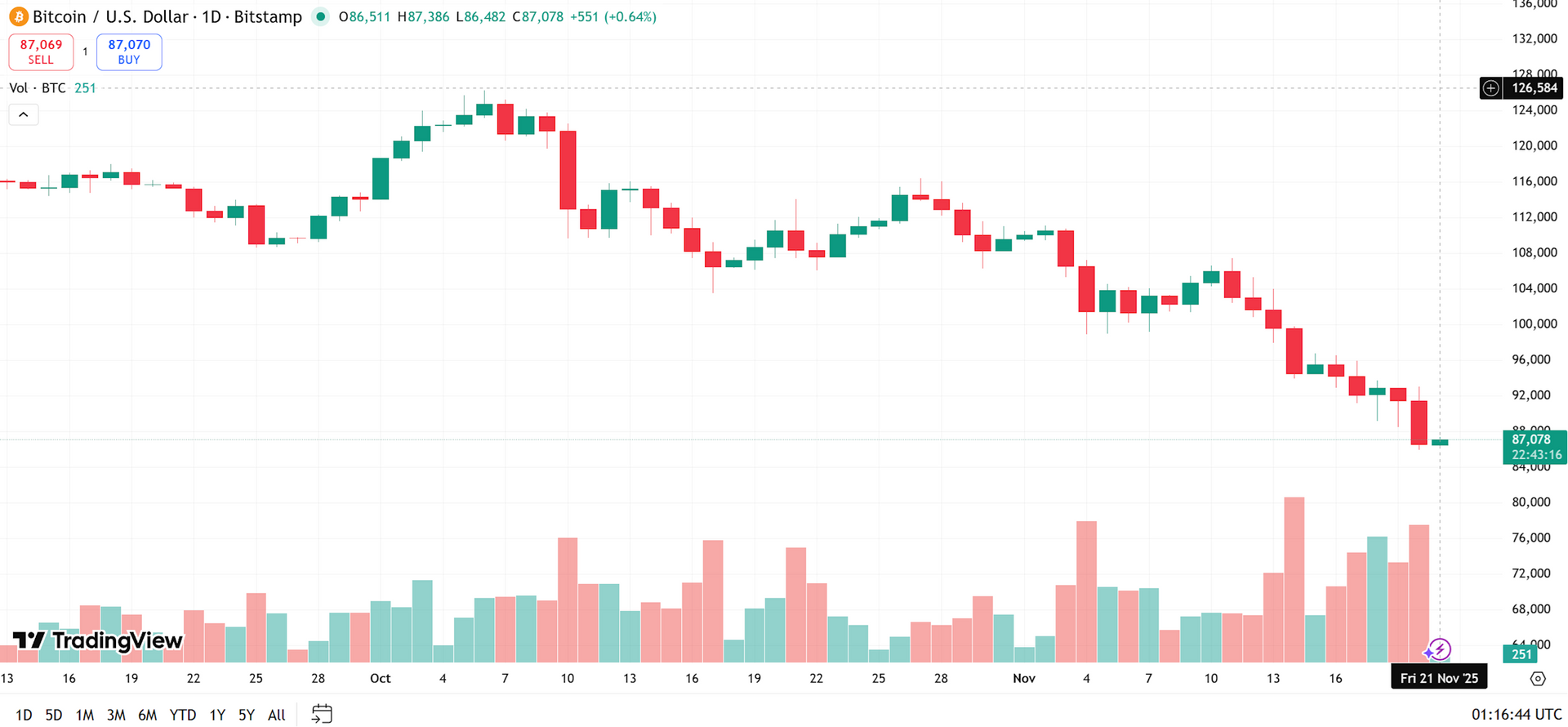 Biểu đồ giá theo ngày của BTC tính đến 21.11 - Ảnh: TradingView/Bitstamp