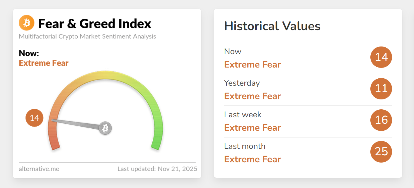 Chỉ số Fear & Greed Index (Chỉ số Sợ hãi và Tham lam) của thị trường tiền mã hóa ngày 21.11 ghi nhận mức 14 điểm, tiếp tục nằm trong vùng “sợ hãi tột độ” (Extreme Fear). Mặc dù tăng nhẹ so với ngày hôm qua (11 điểm), tâm lý chung của nhà đầu tư vẫn ở trạng thái bi quan cao độ, phản ánh rõ sự lo lắng sau chuỗi ngày giảm sâu của Bitcoin và thị trường altcoin.