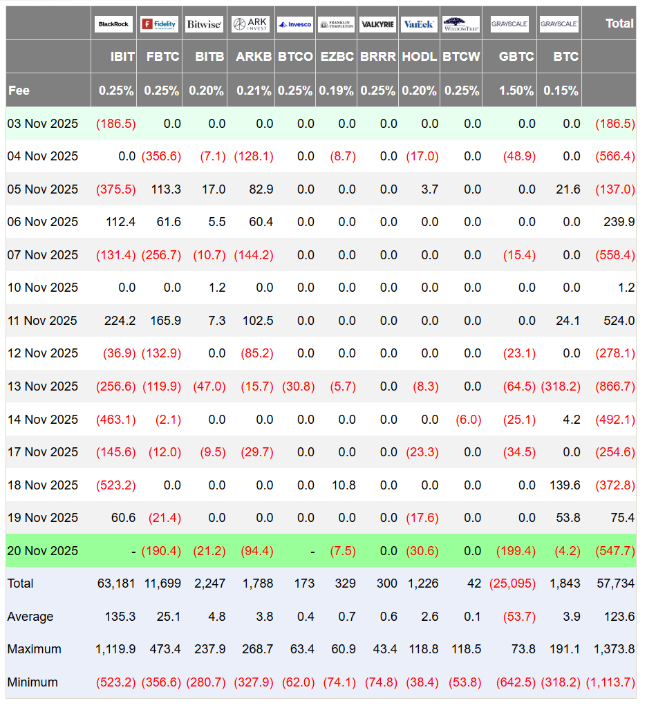 Dữ liệu dòng tiền ETF Bitcoin ngày 20.11 cho thấy thị trường quay lại trạng thái tiêu cực sau phiên hồi phục nhẹ trước đó vào 19.11. Tổng dòng vốn ròng toàn thị trường (chưa tính BlackRock và Invesco do chưa cập nhật) ghi nhận mức rút ròng 547,7 triệu USD, đánh dấu phiên bán ra mạnh nhất kể từ đầu tuần.