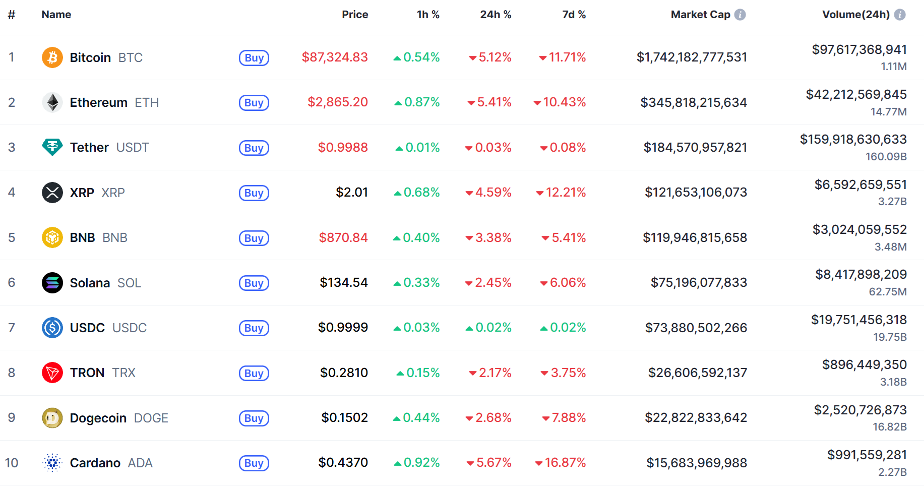 Ethereum (ETH) - đồng tiền mã hóa lớn thứ hai thị trường, giảm 5,41%, hiện giao dịch quanh 2.865 USD, đánh dấu chuỗi phiên giảm sâu liên tiếp. XRP cũng chịu chung xu hướng, mất 4,59%, lùi về 2,01 USD.