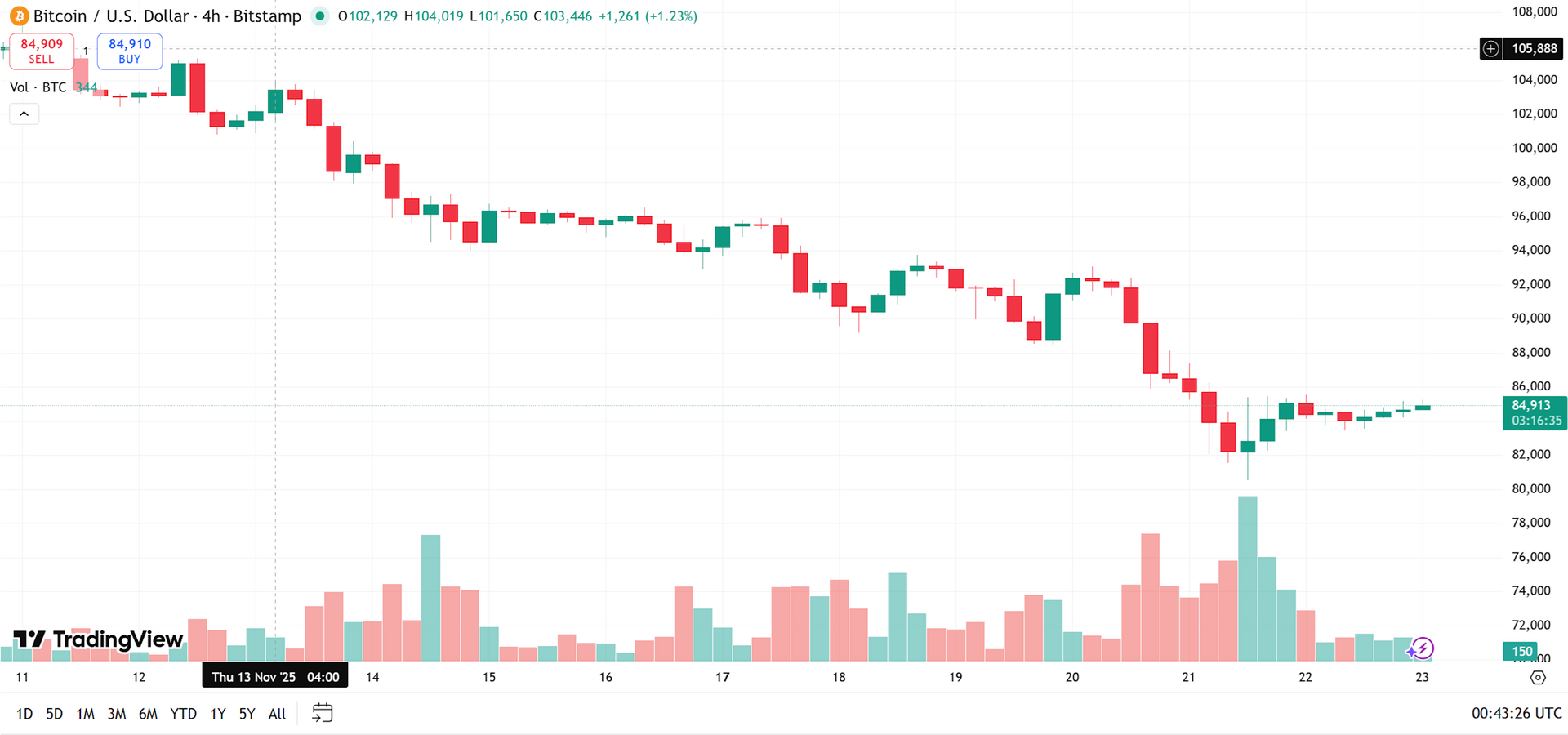 Trên khung 4 giờ, diễn biến ngắn hạn cho thấy Bitcoin đang có dấu hiệu tạm thời tạo đáy ngắn hạn. Sau khi giảm mạnh về 80.600 USD, BTC đã bật tăng nhẹ trở lại và dao động quanh 85.000 USD.