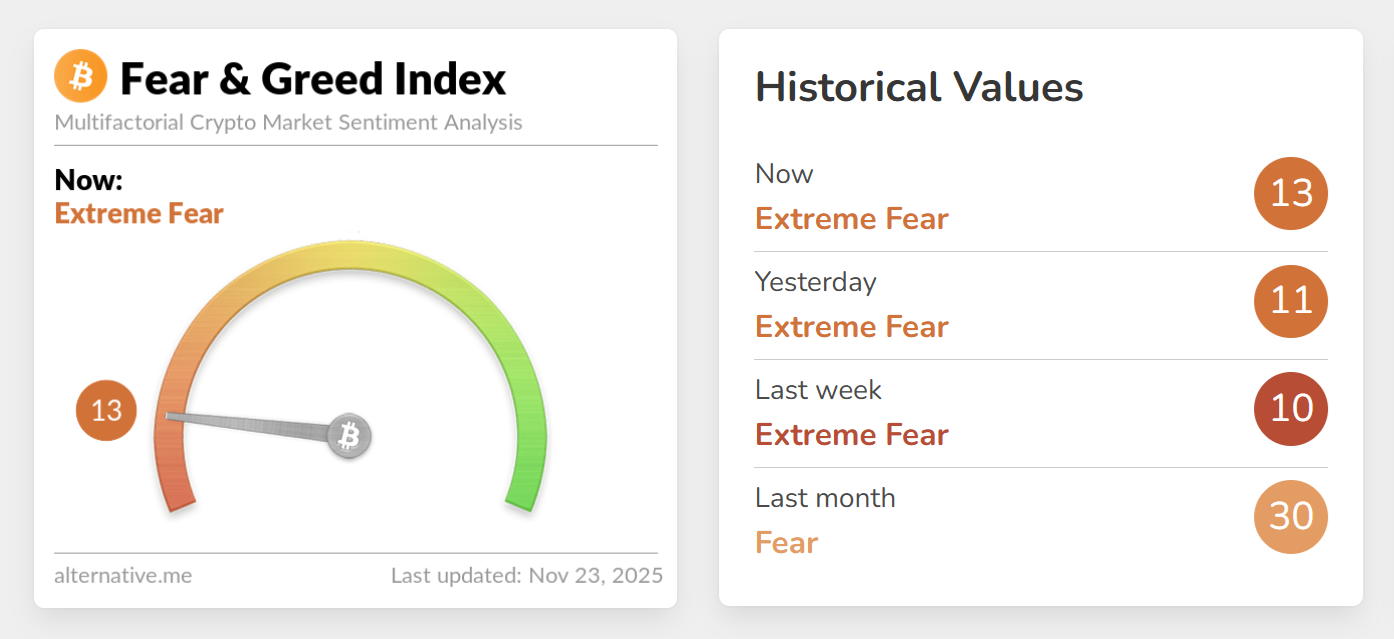 Chỉ số Fear & Greed Index của thị trường tiền mã hóa ngày 23.11 đang ở mức 13 điểm, tiếp tục nằm trong vùng “sợ hãi tột độ” (Extreme Fear). Mặc dù chỉ số này đã nhích nhẹ so với ngày hôm qua (11 điểm) và cao hơn một chút so với tuần trước (10 điểm), nhưng vẫn phản ánh tâm lý lo ngại sâu sắc và thiếu niềm tin của nhà đầu tư trên toàn thị trường.