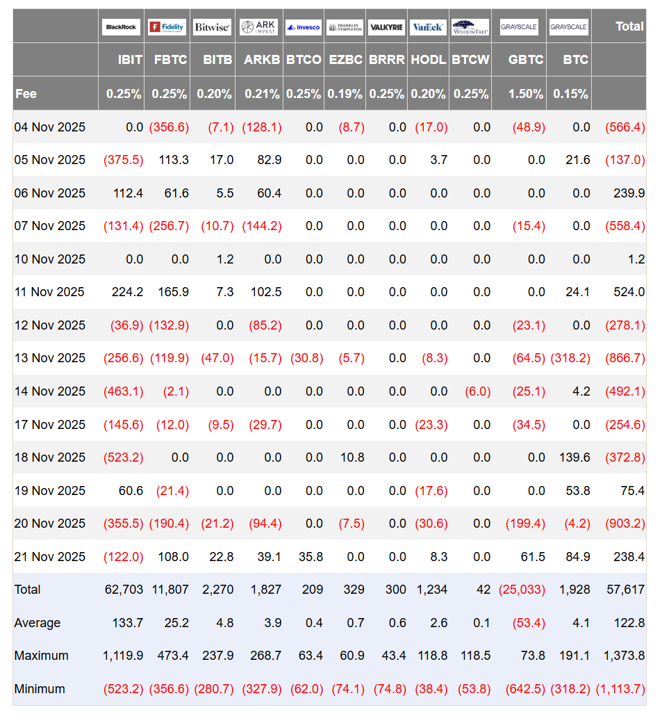 Ngày 17.11, tổng rút ròng đạt 254,6 triệu USD, trong đó . BlackRock (IBIT) ghi nhận dòng tiền âm 145,6 triệu. Fidelity (FBTC) và Ark Invest (ARKB) lần lượt bị rút 12 triệu USD và 29,7 triệu USD USD, trong khi các quỹ nhỏ hơn như Grayscale (GBTC) và WisdomTree (BTCW) tiếp tục bị rút nhẹ. Sang ngày 18.11, đà rút vốn càng tăng tổng rút ròng toàn thị trường lên 372,8 triệu USD.