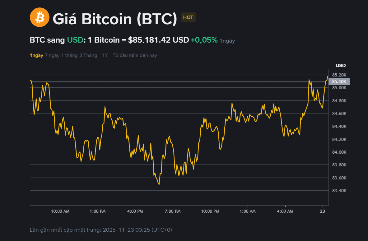 Giá Bitcoin hiện đang giao dịch quanh mức 85.181 USD, với vốn hóa thị trường vào khoảng 1.700 tỉ USD và khối lượng giao dịch trong 24 giờ đạt hơn 40 tỉ USD. Trong phiên ngày 22.11, đồng tiền số này duy trì trạng thái dao động hẹp, biến động trong vùng 83.500 - 85.500 USD.