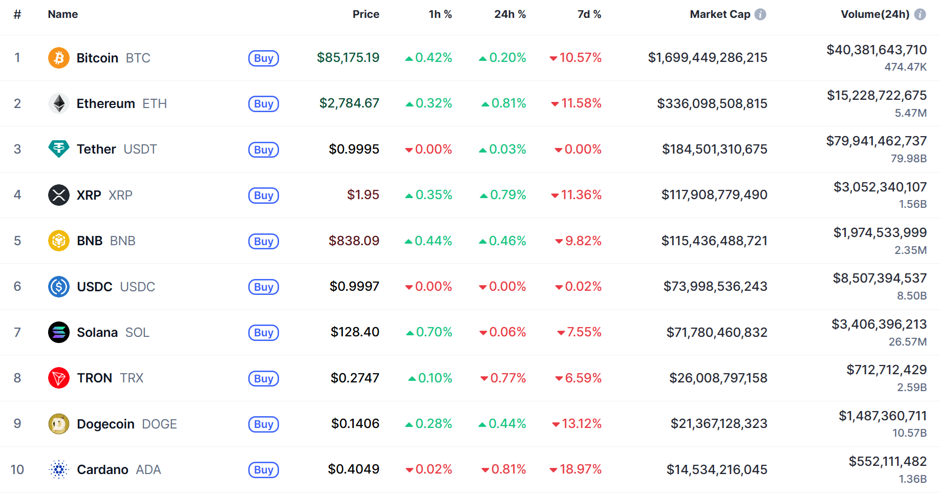 Ethereum (ETH) ghi nhận mức tăng 0,81%, giao dịch quanh ngưỡng 2.784 USD. XRP cũng tăng 0,79% lên 1,95 USD, trong khi BNB, token của hệ sinh thái Binance, nhích nhẹ 0,46% lên 838 USD.