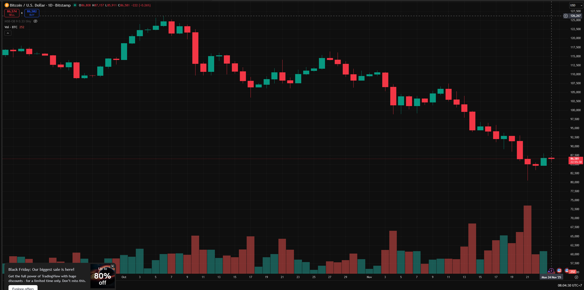 Quan sát khung ngày (1D), giá BTC đang dao động quanh vùng 87.000 USD, sau chuỗi nến đỏ kéo dài từ đầu tháng 11. Mặc dù áp lực bán vẫn chiếm ưu thế, nhưng biên độ giảm đang thu hẹp dần, thể hiện qua các cây nến có thân ngắn và khối lượng giao dịch bắt đầu giảm.