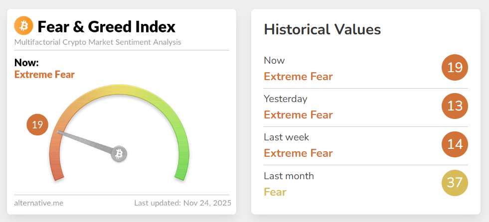 Chỉ số Fear & Greed Index của thị trường tiền mã hóa ngày 24.11 đạt mức 19 điểm, tiếp tục nằm trong vùng “sợ hãi tột độ” (Extreme Fear). Dù vẫn ở vùng tâm lý tiêu cực, mức này đã tăng nhẹ so với 13 điểm của ngày hôm qua và 14 điểm của tuần trước, cho thấy tâm lý bi quan của nhà đầu tư đang phần nào được cải thiện, dù còn khá mong manh.