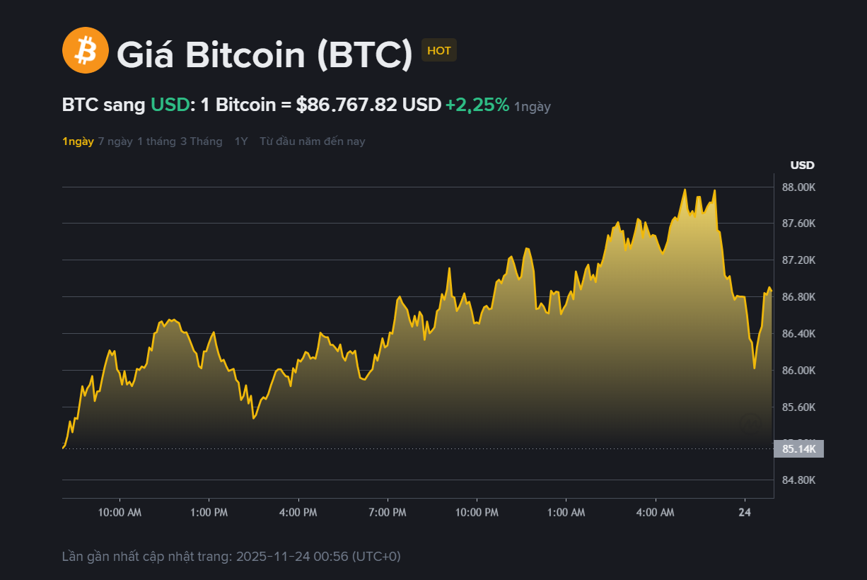 Hiện tại, Bitcoin đang được giao dịch quanh mức 86.767 USD, với vốn hóa thị trường đạt khoảng 1.730 tỉ USD và khối lượng giao dịch trong 24 giờ vượt 60 tỉ USD. Trong phiên giao dịch ngày 23.11, giá BTC biến động trong biên độ 84.700 - 88.100 USD.