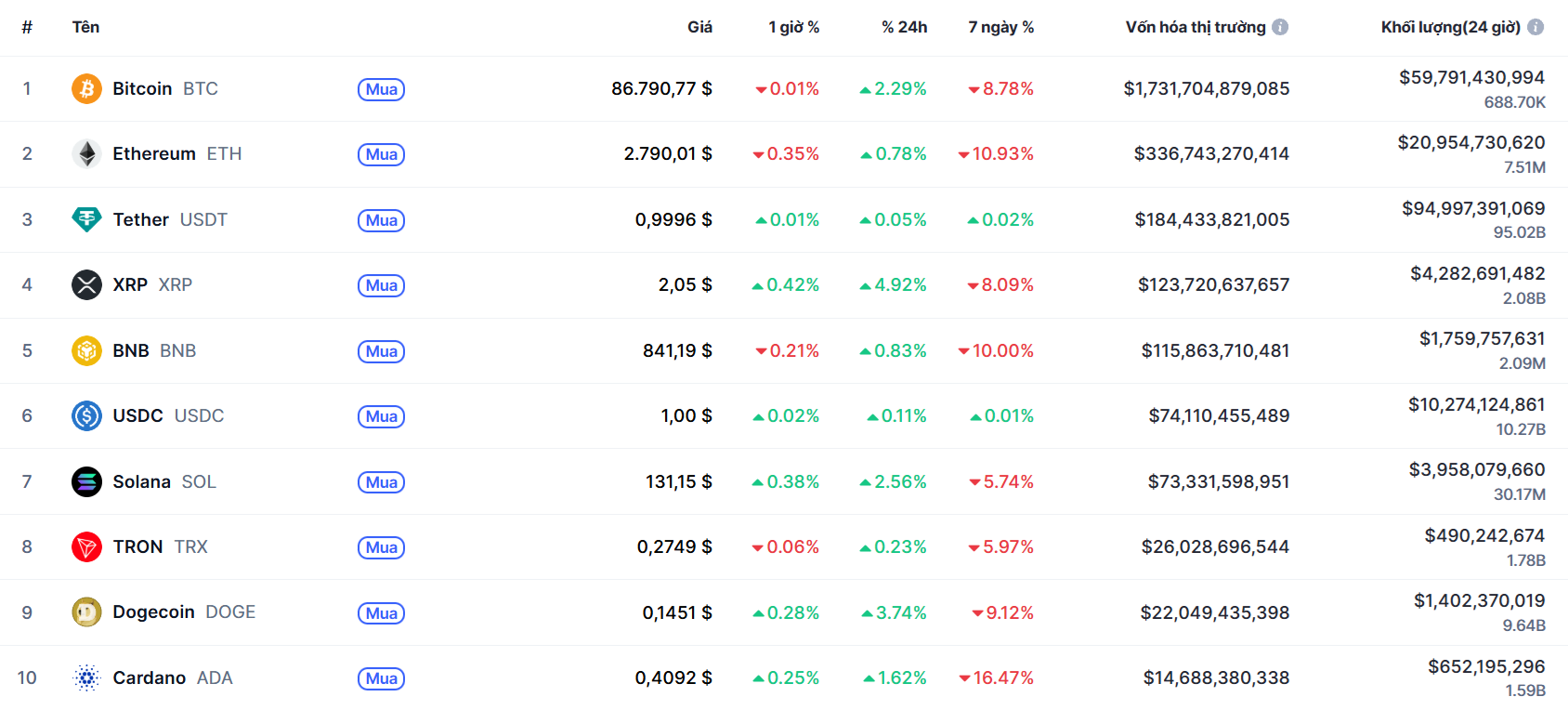 Biến động của Top 10 đồng coin lớn nhất thế giới