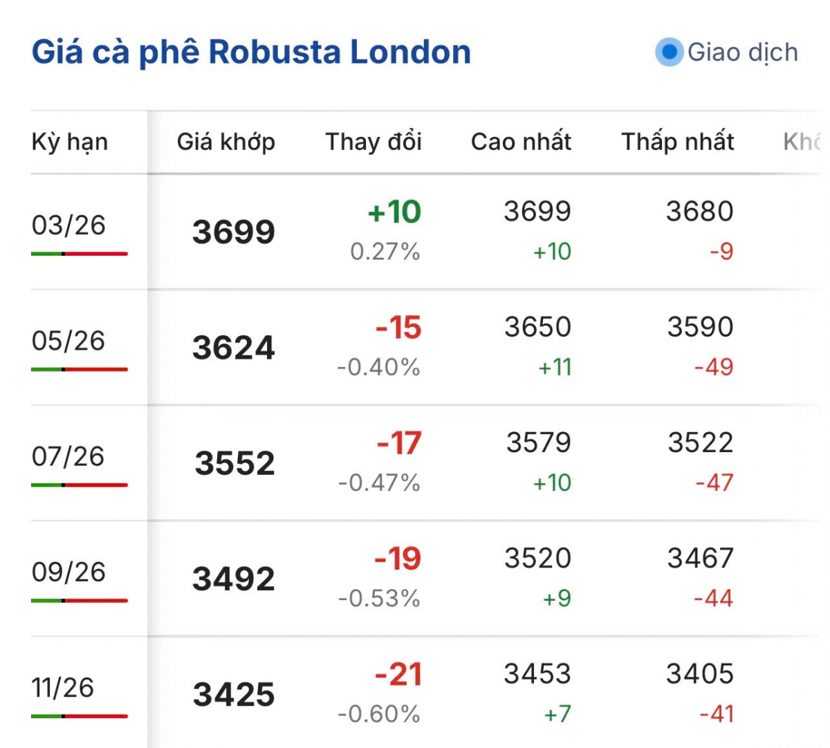 Cụ thể, giá cà phê Robusta hợp đồng kỳ hạn giao tháng 3/2026 trên sàn London đi ngang ở mức 3.699 USD/tấn.
