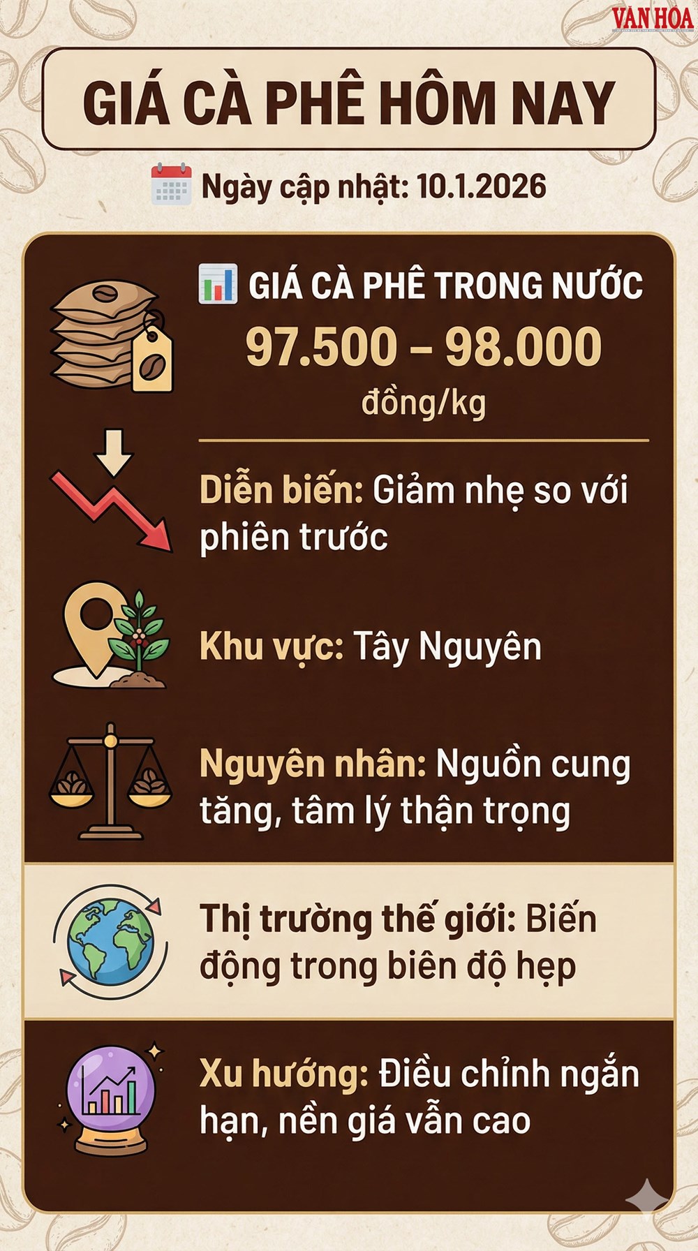 Thị trường cà phê trong nước ngày 10.1 ghi nhận xu hướng điều chỉnh nhẹ khi giá thu mua cà phê nhân xô tại các tỉnh Tây Nguyên đồng loạt giảm so với phiên liền trước. Mức giá phổ biến hiện dao động trong khoảng 97.500-98.000 đồng/kg, giảm khoảng vài trăm đồng mỗi kg so với những ngày đầu tuần.