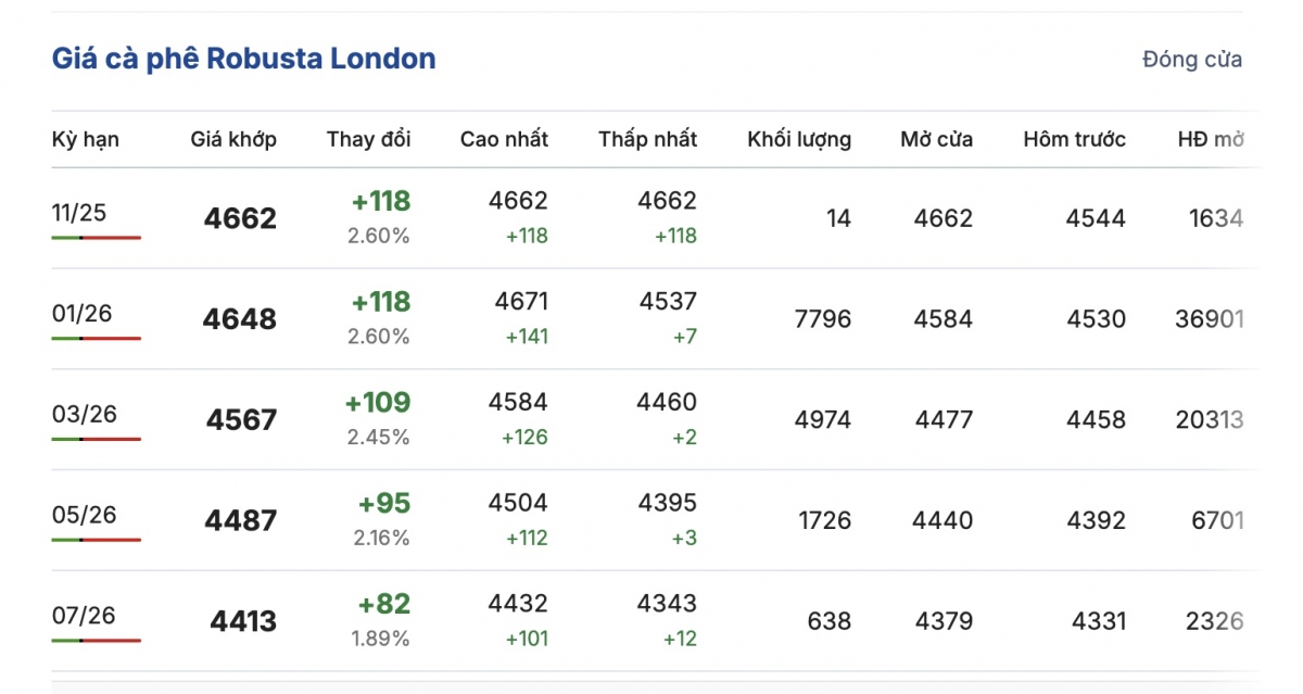 Giá cà phê thế giới sáng nay (thứ Hai 10/11 - theo giờ Việt Nam) trên 2 sàn giao dịch quốc tế tiếp tục tăng. Cụ thể, giá cà phê Robusta hợp đồng kỳ hạn giao tháng 9/2025 trên sàn London tăng 2,60%, tương đương tăng 118 USD/tấn so với phiên trước, giá bán đang là 4.662 USD/tấn.
