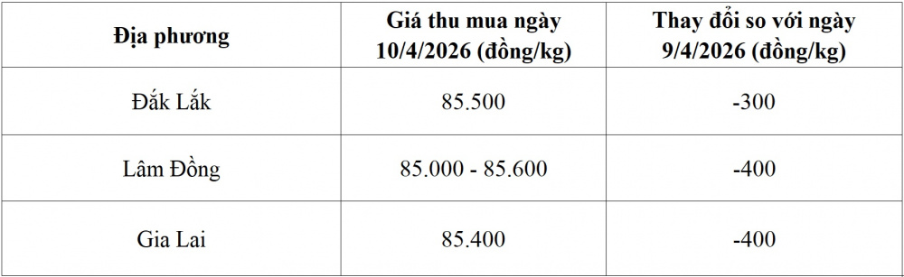 Tham khảo giá cà phê hôm nay ngày 10/4/2026 tại thị trường trong nước (Nguồn: Tạp chí Công Thương tổng hợp)
