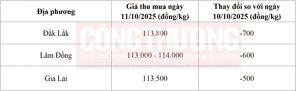 Tham khảo giá cà phê hôm nay ngày 11/10/2025 tại thị trường trong nước (Nguồn: Tạp chí Công Thương tổng hợp)