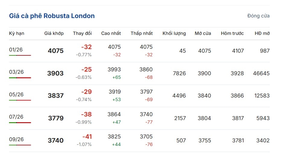 Giá cà phê trên thị trường thế giới tối 11/1 (theo giờ Việt Nam) tiếp tục giảm trên cả 2 sàn giao dịch quốc tế. Cụ thể, giá cà phê Robusta hợp đồng kỳ hạn giao tháng 1/2026 trên sàn London giảm 0,77%, tương đương 32 USD/tấn so với phiên giao dịch trước đó, hiện giao dịch ở mức 4.075 USD/tấn.