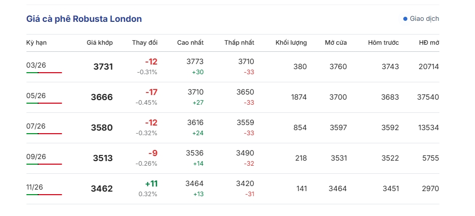 Giá cà phê trên thị trường thế giới tối 11/2 (theo giờ Việt Nam) tiếp tục giảm trên cả 2 sàn giao dịch quốc tế. So với phiên giao dịch gần nhất, giá cà phê Robusta London dao động ở mức 3.710 – 3.773 USD/tấn. Cụ thể, giá cà phê Robusta hợp đồng kỳ hạn giao tháng 3/2026 trên sàn London giảm 0,31%, tương đương 12 USD/tấn, giao dịch ở mức 3.713 USD/tấn.