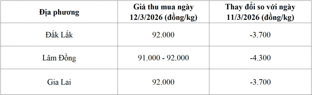 Trong bối cảnh giá thế giới giảm, thị trường cà phê trong nước cũng nhanh chóng điều chỉnh theo xu hướng chung. Tại khu vực Tây Nguyên, vùng trồng cà phê trọng điểm của Việt Nam giá cà phê nhân xô trong ngày 12/3 giảm trung bình gần 4.000 đồng/kg so với ngày trước đó. Mức giá giao dịch phổ biến dao động quanh ngưỡng 91.000 - 92.000 đồng/kg tùy từng địa phương.