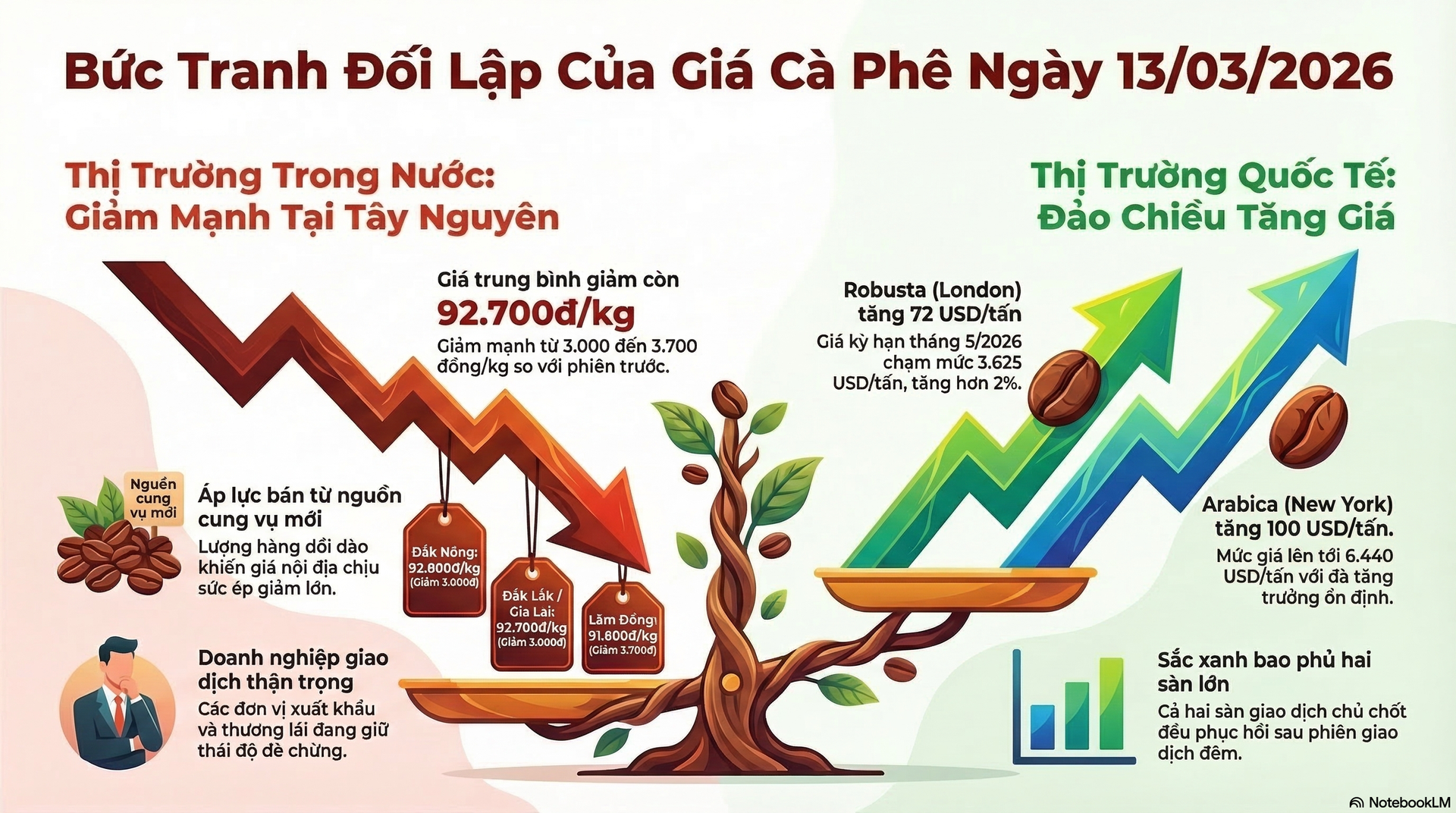 Dù giá cà phê hôm nay 13/3/2026 trong nước giảm mạnh, thị trường thế giới lại ghi nhận đà tăng trên cả hai sàn giao dịch lớn.