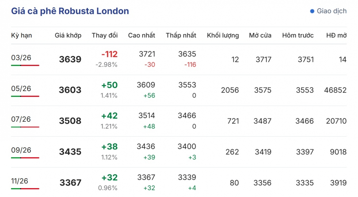 Giá cà phê thế giới vào lúc 21h00 tối nay (12/3 - theo giờ Việt Nam) đang ở trạng thái cùng giảm trên 2 sàn giao dịch quốc tế. Cụ thể, giá cà phê Robusta hợp đồng kỳ hạn giao tháng 3/2026 trên sàn London giảm 2,98%, tương đương giảm 112 USD/tấn, giá giao dịch đang là 3.639 USD/tấn.