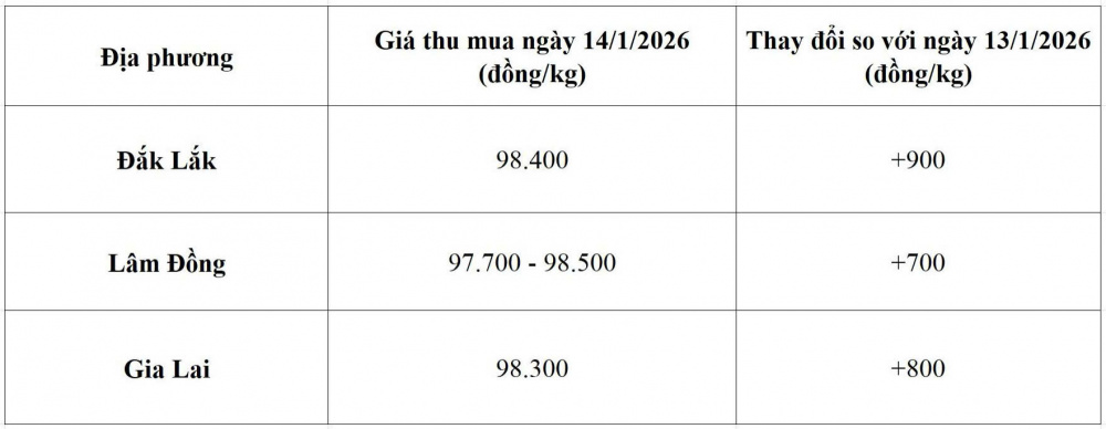 Tham khảo giá cà phê hôm nay ngày 14/1/2026 tại thị trường trong nước (Nguồn: Tạp chí Công Thương tổng hợp)