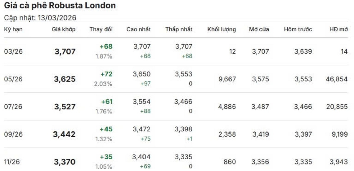 Cụ thể, giá cà phê Robusta hợp đồng kỳ hạn giao tháng 3/2026 trên sàn London, tăng 1,87%, tương đương 68 USD/tấn lên mức đang là 3.707 USD/tấn.