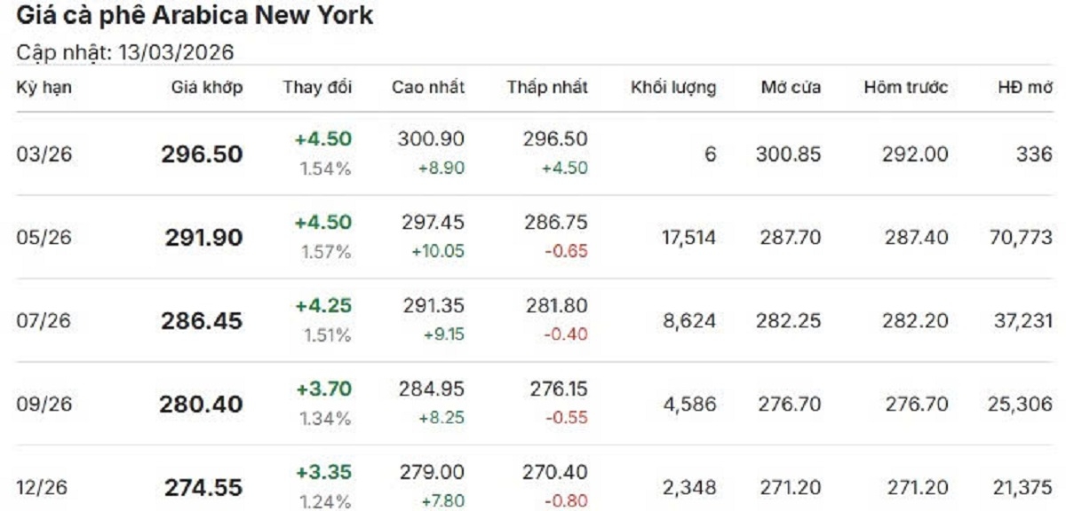 Cùng chốt phiên giao dịch ngày 13/3 (theo giờ New York), giá cà phê Arabica trên sàn New York kỳ hạn giao tháng 3/2026 tăng 1,54%, tương đương 4,5US cent/lb lên mức 296.5 US cent/lb.