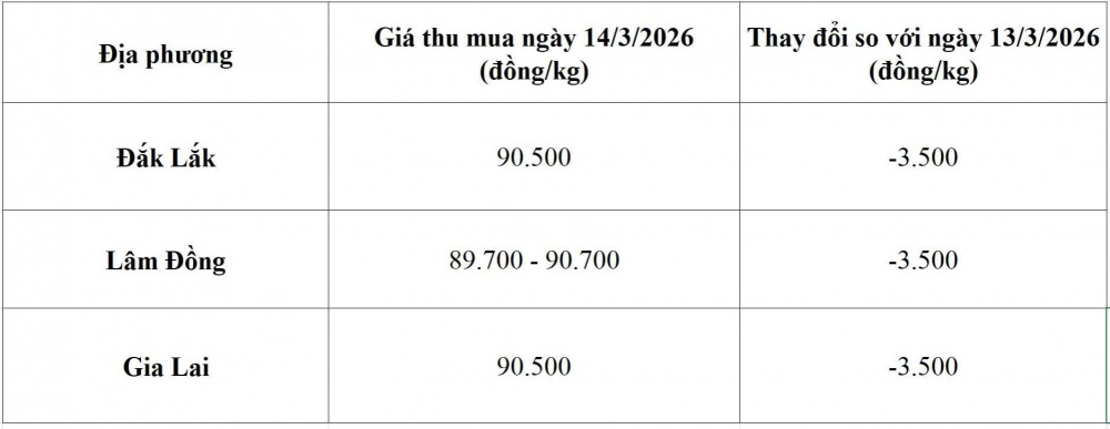 Tham khảo giá cà phê hôm nay ngày 14/3/2026 tại thị trường trong nước (Nguồn: Tạp chí Công Thương tổng hợp)