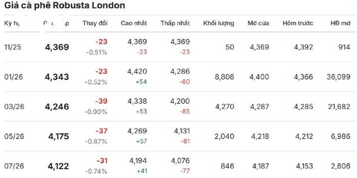 Giá cà phê hôm nay, chốt phiên ngày 14/11, thị trường cà phê thế giới đồng loạt giảm trên cả hai sàn London và New York. Trên sàn London, giá Robusta kỳ hạn tháng 11/2025 giảm 0,51%, tương đương 23 USD/tấn, còn 4.369 USD/tấn.