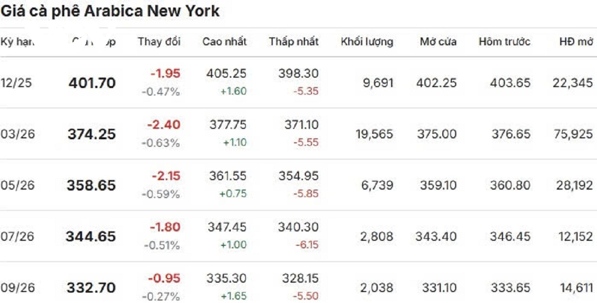 Cùng thời điểm, giá Arabica kỳ hạn tháng 12/2025 trên sàn New York cũng mất 0,47%, tương đương 1,95 cent/lb, xuống còn 401,70 cent/lb so với phiên liền trước.
