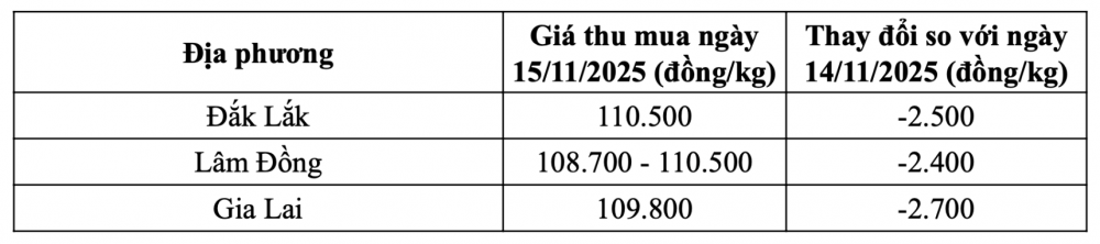 Tham khảo giá cà phê hôm nay ngày 15/11/2025 tại thị trường trong nước (Nguồn: Tạp chí Công Thương tổng hợp)
