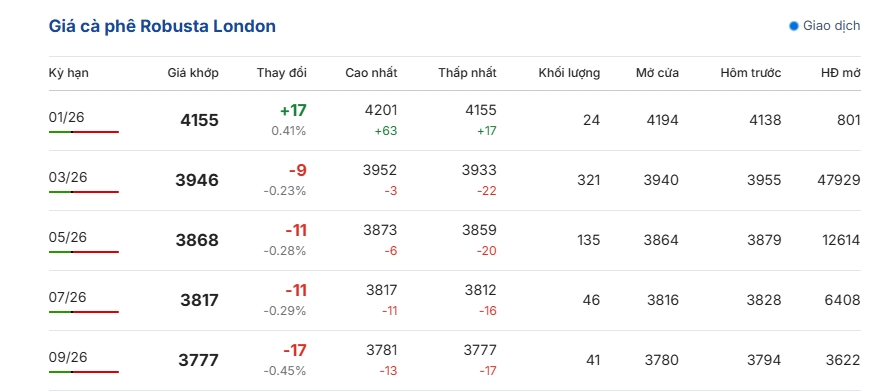 Cụ thể, giá cà phê Robusta hợp đồng kỳ hạn giao tháng 1/2026 trên sàn London giá bán đang là 4.155 USD/tấn.