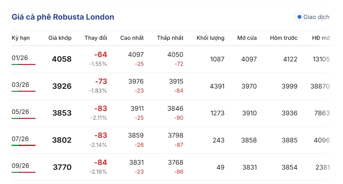 Giá cà phê thế giới vào lúc 21h00 tối nay (15/12 - theo giờ Việt Nam) đang ở trạng thái tăng - giảm đan xen trên 2 sàn giao dịch quốc tế. Cụ thể, giá cà phê Robusta hợp đồng kỳ hạn giao tháng 1/2026 trên sàn London giảm 1,43%, tương đương giảm 59 USD/tấn, giá giao dịch đang là 4.063 USD/tấn.