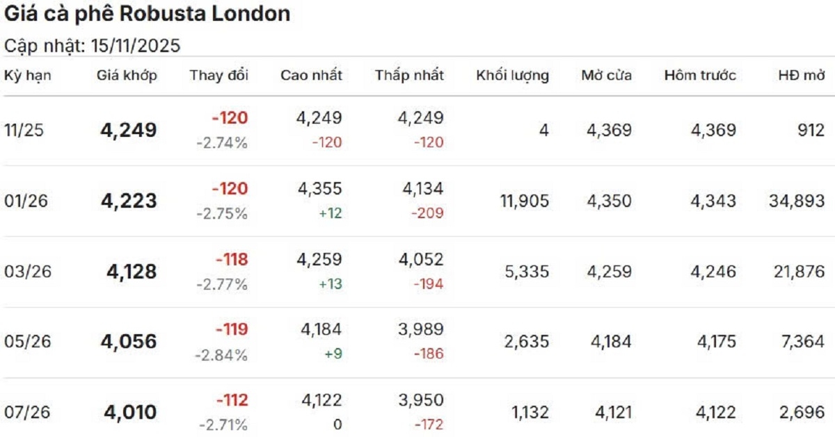 Giá cà phê hôm nay, chốt phiên 16/11, trên thị trường thế giới, giá cà phê cho thấy đà chững lại. Sàn London ghi nhận Robusta kỳ hạn tháng 11/2025 dừng tại 4.249 USD/tấn.