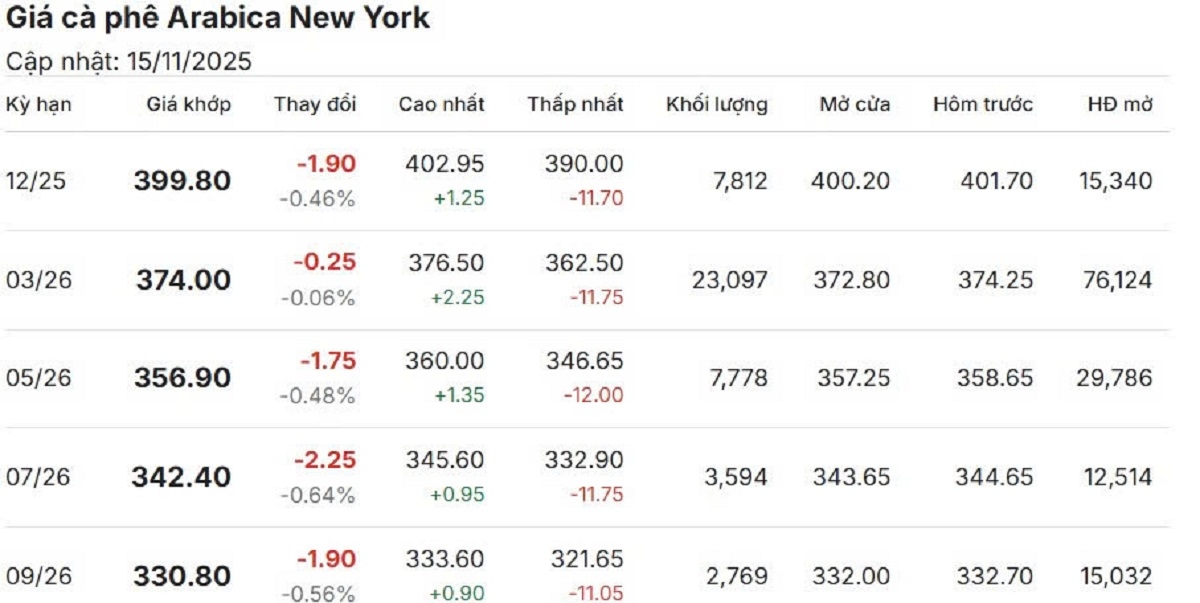 Cùng thời điểm Arabica kỳ hạn tháng 12/2025 trên sàn New York giao dịch ở mức 399,80 cent/lb.
