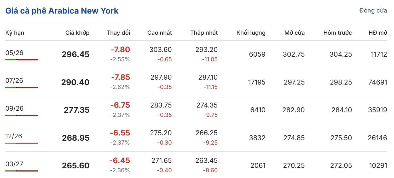 Tại sàn New York (Arabica), đà giảm diễn ra mạnh mẽ hơn do chịu áp lực trực tiếp từ dự báo mùa vụ kỷ lục tại Brazil. Kỳ hạn giao tháng 5/2026 giảm sâu 7,80 US cent/lb (tương đương 2,55%), xuống mức 296,45 US cent/lb. Hợp đồng giao tháng 7/2026 cũng ghi nhận mức giảm 2,62%, đạt 290,40 US cent/lb.