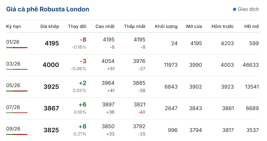 Cụ thể, trên sàn giao dịch London, giá cà phê Robusta hợp đồng kỳ hạn giao tháng 1/2026 trên sàn London đang ở mức 4.195 USD/tấn, giảm 0,18% tương đương giảm 8 USD/tấn so với cuối phiên trước. Cùng chiều giảm, giá cà phê Arabica trên sàn New York kỳ hạn giao tháng 3/2026 đang là 355.30 US cent/lb, giảm 0,77% tương đương giảm 2.80 US cent/lb so với cuối phiên trước.
