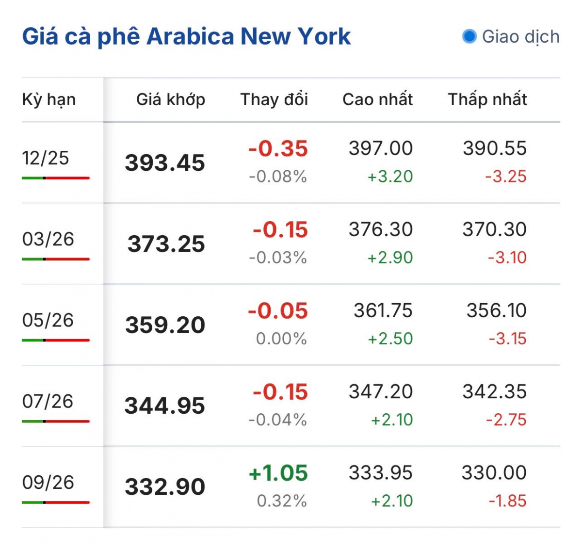 Trong khi đó, cùng thời điểm, giá cà phê Arabica trên sàn New York kỳ hạn giao tháng 12/2025 là 397,45 US cent/lb, tăng 0,93% tương đương 3,65 US cent/lb so với cuối phiên liền trước.